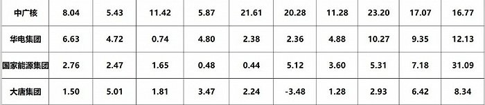 近十年间,五大四小发电集团合计创造净利润1.40万亿,其中4家发电集团创利超1000亿元,依次为国家能源投资集团,合计创利4794亿元;三峡集团,合计创利3009亿元;中国华能集团,合计创利1225亿元;中国广核集团,合计创利1147亿元。其中,中国广核集团是持续盈利最长,其净利润已连续9年实现正增长,其次是国家能源投资集团,持续6年净利润保持正增长。