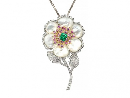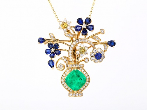 18K黄金镶嵌祖母绿及蓝宝石胸针吊坠,祖母绿共重约1.85克拉,vivid Green,微油,配镶蓝宝石及粉色蓝宝石,配镶钻石0.8克拉。