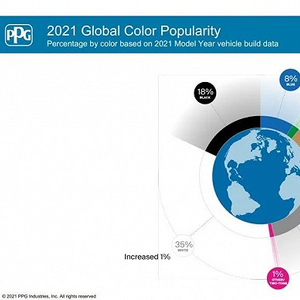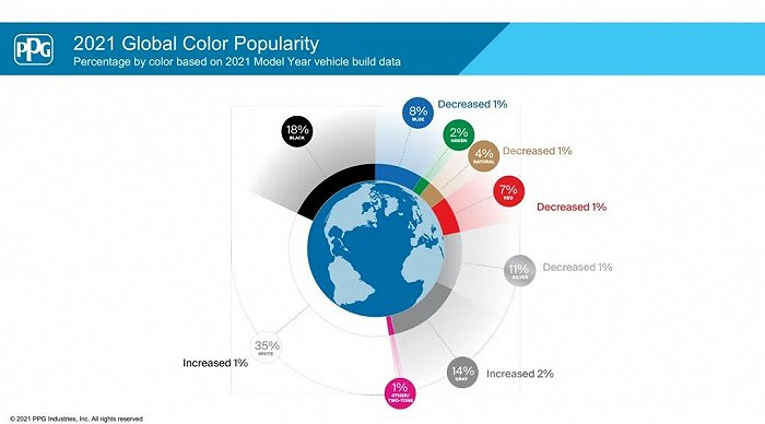 PPG公布的2021汽车流行色显示,白色的占比高达35%,黑色18%,灰色和银色加起来有25%。