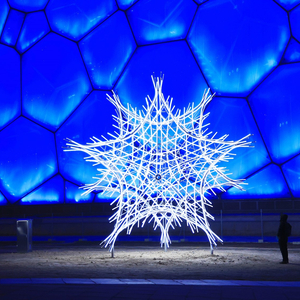 团队经过为期一年的设计与建造,最终完成八件编织立体雪花灯,它们被命名为“雪绒星”,片片雪花聚合成的立体雕塑晶莹剔透,与不远处的冰立方和鸟巢相映成辉,并以其纯洁灿烂向世人传递一幅人类命运共同体的美好愿景。