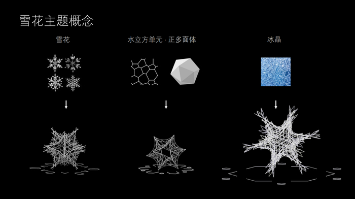 本次项目中,团队立足于对雪花这类六轴对称晶体形式的研究,提取了对称美这一重要形式原理,并且希望能够突破传统的平面雪花造型在观赏角度、形态丰富度上的局限性,提出一种更适合于大型艺术装置的、可从多角度观察的新雪花形态,以适应城市广场、自然山水等开阔空间的需要。