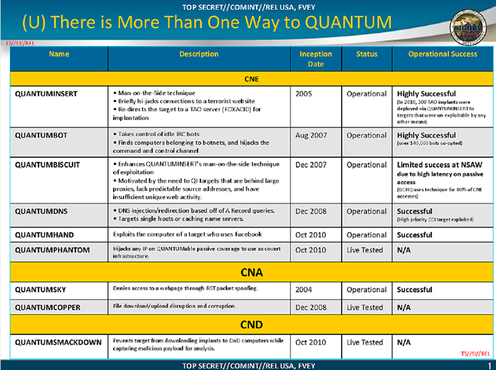 QUANTUM(量子)攻击系统是NSA发展的一系列网络攻击与利用平台的总称,其下包含多个子项目,均以QUANTUM开头命名。它是NSA最强大的互联网攻击工具,也是NSA进行网络情报战最重要的能力系统之一,最早的项目从2004年就已经开始创建。