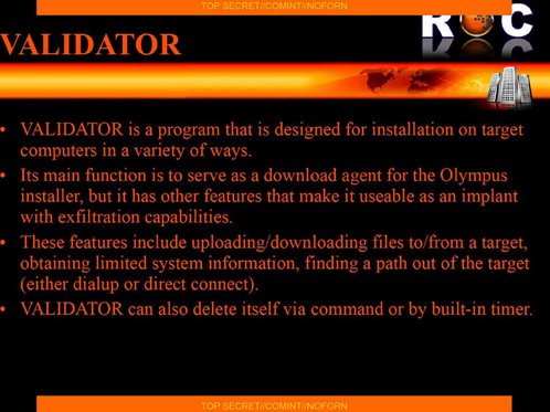 Validator(验证器)是用于FoxAcid项目的主要后门程序之一,一般被用于NSA的初步入侵,通过其再植入更复杂的木马程序,比如UnitedRake(联合耙),每个被植入的计算机系统都会被分配一个唯一的验证ID。