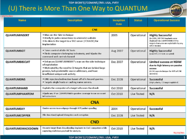 QUANTUM(量子)攻击系统是NSA发展的一系列网络攻击与利用平台的总称,其下包含多个子项目,均以QUANTUM开头命名。它是NSA最强大的互联网攻击工具,也是NSA进行网络情报战最重要的能力系统之一,最早的项目从2004年就已经开始创建。