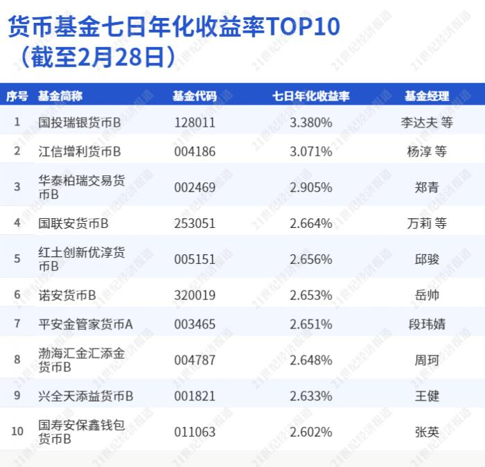 从本周货基七日年化收益表现来看,货基市场逐渐“回暖”。本次榜单中有两只产品七日年化收益超过3%,整体收益较上周有所提高,“国投瑞银货币B”凭借七日年化3.380%摘得桂冠。