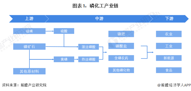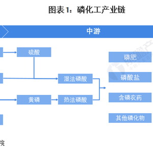 磷化工行业是指以磷矿石为原料,通过化学方法将矿石中的磷元素加工成为产品的化工子行业,其基础原料主要是磷矿石和硫磺。磷化工的上游是磷矿石。按工艺的不同,磷矿石可以直接制成磷酸,接着加工成各种磷化工产品;也可以先制得黄磷,再制成磷酸;黄磷同时还可制备三氯化磷,后者是生产草甘膦等农药的重要原料。磷肥行业的中游是湿法磷酸,再进一步生产出磷肥,下游为农业生产。而磷酸盐行业的中游是生成热法黄磷,通过加工再生成磷酸盐。磷酸盐应用于下游的工业洗涤剂、金属表面处理、工业水处理、建筑工业、医药、塑料增塑剂等领域。