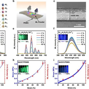 中国科学院兰州化学物理研究所研究员王赵锋团队长期致力于机械发光研究。近日,该研究团队与合作者报道了一类非压电机械发光材料Sr3Al2O5Cl2:Ln (SAOCL; Ln = Eu2+, Tb3+, Ce3+),该类材料具有非常高的对称性,其在粉体状态或与硬质环氧树脂复合后无机械发光现象,当其与柔性聚二甲基硅氧烷(PDMS)复合后可产生明亮的机械发光(图1)。