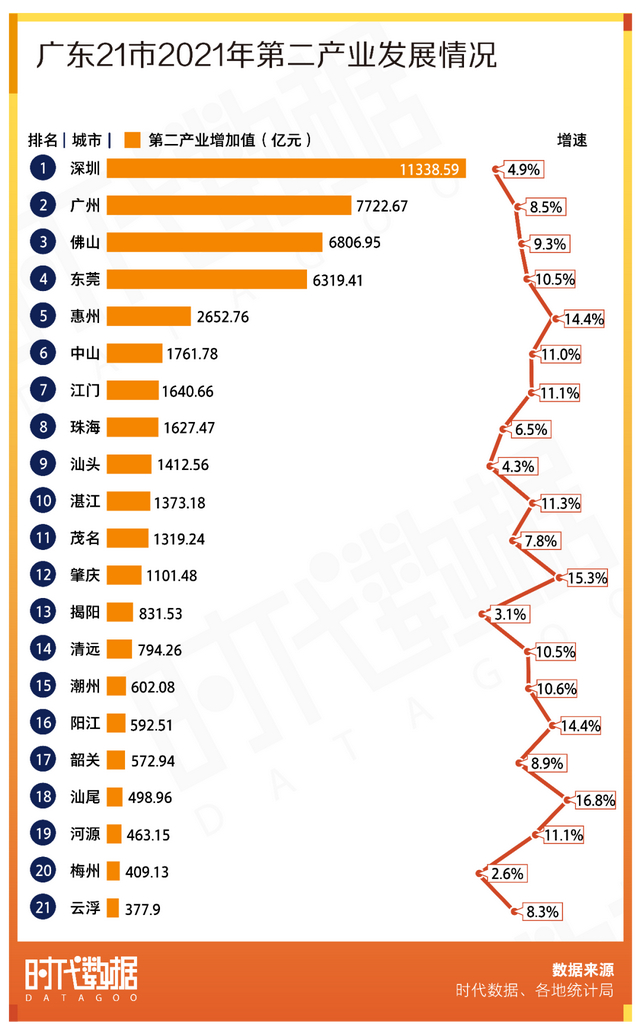 从第二产业增加值来看,深圳第二产业增加值达到11338.59亿元,领跑全省;广州、佛山、东莞分别以7722.67亿元、6806.95亿元、6319.41亿元的第二产业增加值分列二至四位。