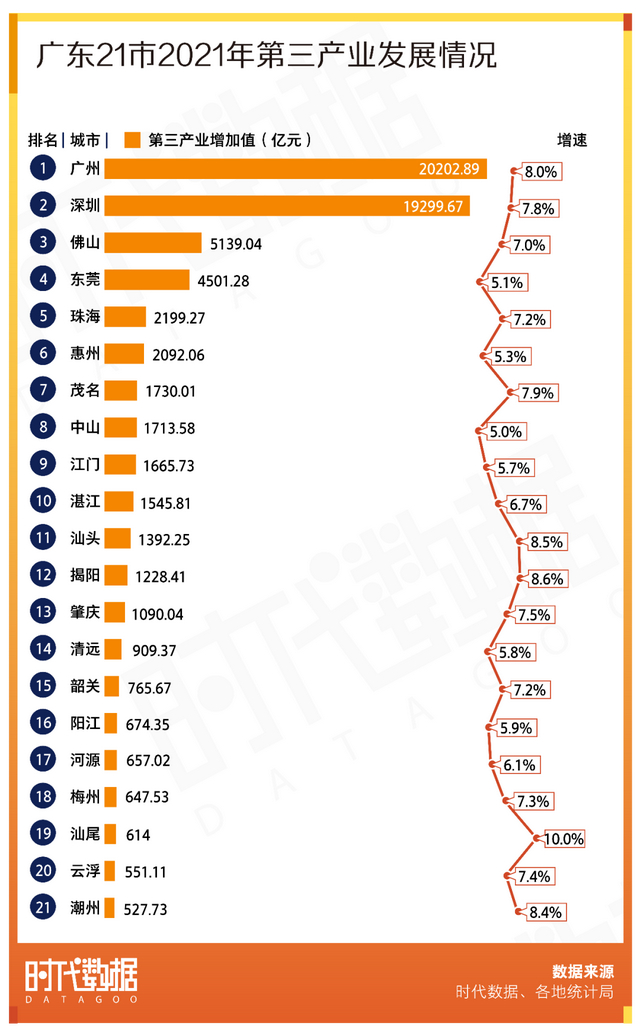 从第三产业增加值来看,广州、深圳最为亮眼,高居全省前二。其中,广州第三产业增加值达到20202.89亿元,位居第一;其后,深圳以19299.67亿元的第三产业增加值位居第二,佛山以5139.04亿元的第三产业增加值位居第三。