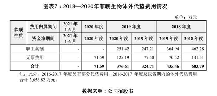 据招股书,2016—2020年,菲鹏生物为支付部分无票费用,以及增加部分员工的激励,公司通过由实际控制人或其控制的关联自然人、公司账户代垫费用。期间体外代垫金额分别为3658.82万元(2016—2017年)、603.79万元(2018年)、760.17万元(2019年资金流期间合计)、448.2万元(2020年资金流期间合计)。