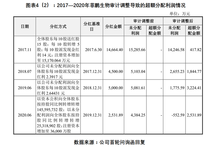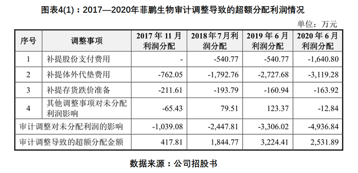 审计调整后,菲鹏生物2017年至2020年6月的利润分配导致的超额分配金额分别为417.81万元、1844.77万元、3224.41万元、2531.89万元。