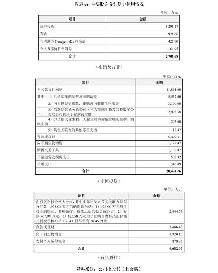 其中,实控人崔鹏及曹菲取得的分红资金主要用于证券投资、存款、个人及家庭消费。雯博投资取得的分红资金有3100万元借给崔鹏,用于向菲鹏生物增资。百奥科技取得的分红资金有1975.03万元向合伙人分红。