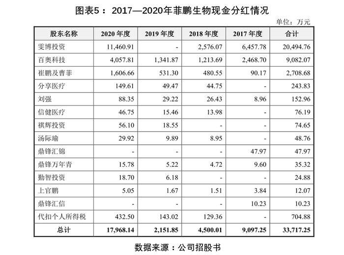 从现金分红的分配情况看,现金分红主要派发给了控股股东雯博投资(实控人崔鹏、曹菲100%持股)、百奥科技(菲鹏生物员工持股平台,雯博投资持股58.7%,崔鹏持股7.28%)、崔鹏及曹菲。