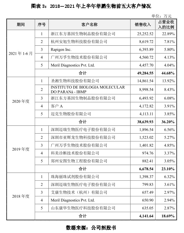 2021年上半年,菲鹏生物的前五大客户销售收入占比已涨至44.68%,比2018年的18.60%提升近26个百分点,客户集中度提升较快。那么,该公司的客户稳定性如何?