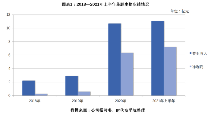 据招股书,2018—2021年上半年(以下简称“报告期内”),菲鹏生物营业收入分别为2.21亿元、2.89亿元、10.68亿元、11.03亿元,净利润分别为2460.28万元、5745.49万元、6.33亿元、7.19亿元。