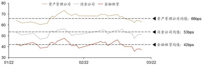注:选取2018年以来发行的,隐含评级AAA-的AMC存续普通金融债券17支,隐含评级AA+的消金公司存续普通金融债券13支,隐含评级AAA-的金融租赁存续普通金融债券43支。