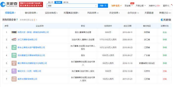 天眼查App显示,吴毅名下共有7家公司,5家为存续状态,分别为陕西文投(影视)银海投资有限公司、浙江天意影视有限公司、新余上善若水资产管理有限公司、深圳景藤互乐营销有限责任公司、霍尔果斯向日葵影视文化有限公司,多数是影视相关公司,吴毅为股东或担任法定代表人、董事、总经理等职位。
