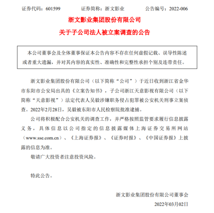 3月1日晚间,浙文影业公告称,公司于近日收到浙江省金华市东阳市公安局出具的《立案告知书》,子公司浙江天意影视有限公司(简称“天意影视”)法定代表人吴毅涉嫌职务侵占犯罪,被公安机关刑事立案侦查。2月28日,吴毅被东阳市人民检察院批准逮捕。