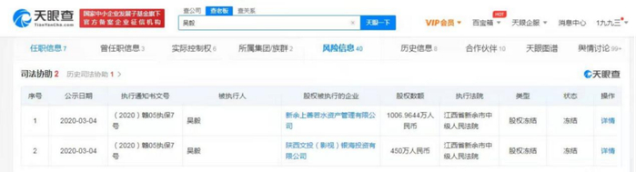值得注意的是,吴毅持有新余上善若水资产管理有限公司和陕西文投(影视)银海投资有限公司合计约1457万股权,已于2020年被冻结。