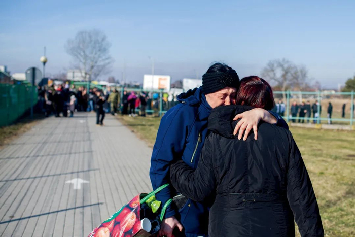 2月26日,大量人群从乌克兰涌入波兰。一对亲人在团聚后相拥而泣。图/视觉中国