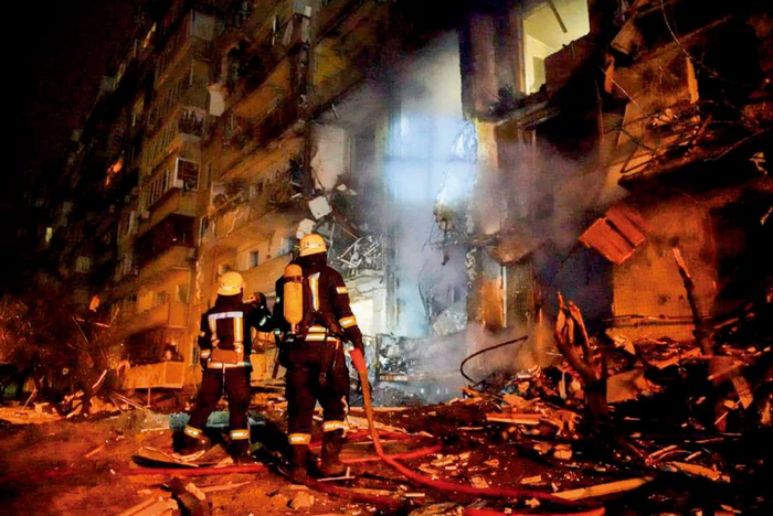2月25日,乌克兰基辅一栋住宅楼遭到炮击引发大火。图/人民视觉