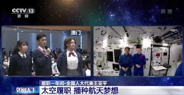 2021年12月9日,中国空间站首次太空授课活动“天宫课堂”开讲。课堂上,除了和北京、广西南宁、四川汶川的青少年展开互动,王亚平还与来自香港、澳门青年学生分享了太空的奇妙。
