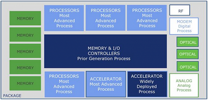 借助chiplet技术,一个大型芯片不需要全部使用昂贵的7nm、5nm等先进制程,而是可以根据自身需求,混合搭配由多个芯片制造商、多个制程节点制造的芯片模块,将它们封装在一起。这样既有助于提高效率,又减少了经济负担。