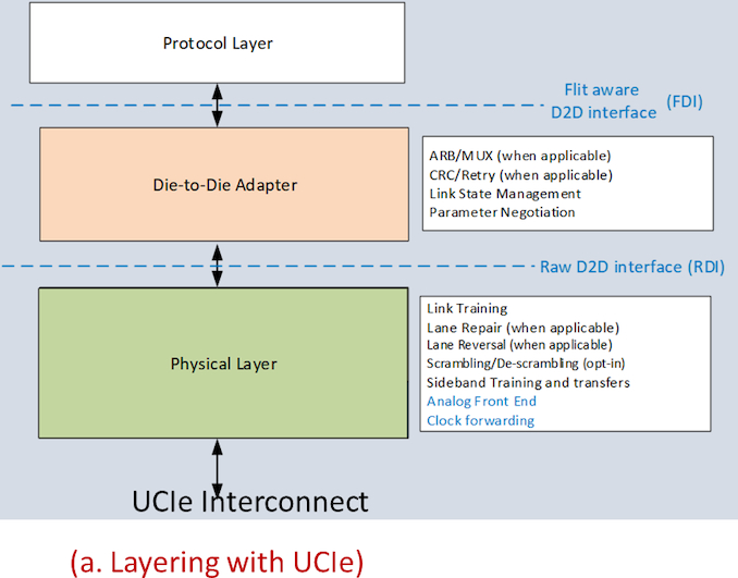 UCIe是一个分层协议,包含物理层、Die-to-Die适配器和协议层。