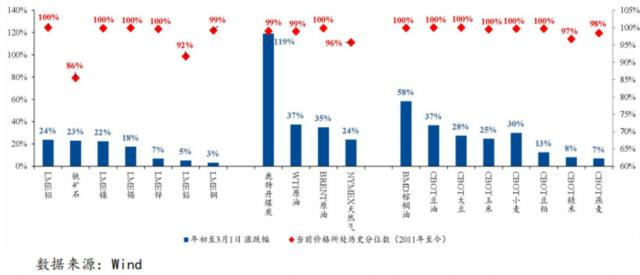 “做空PPI、做多CPI”策略失效,根源在于大宗商品价格年初以来,一路大涨。比如,能源类商品中,从1月1日至3月1日,鹿特丹煤炭价格上涨了119%,WTI、Brent原油价格分别上涨了37%、35%,NYMEX天然气价格上涨了24%。
