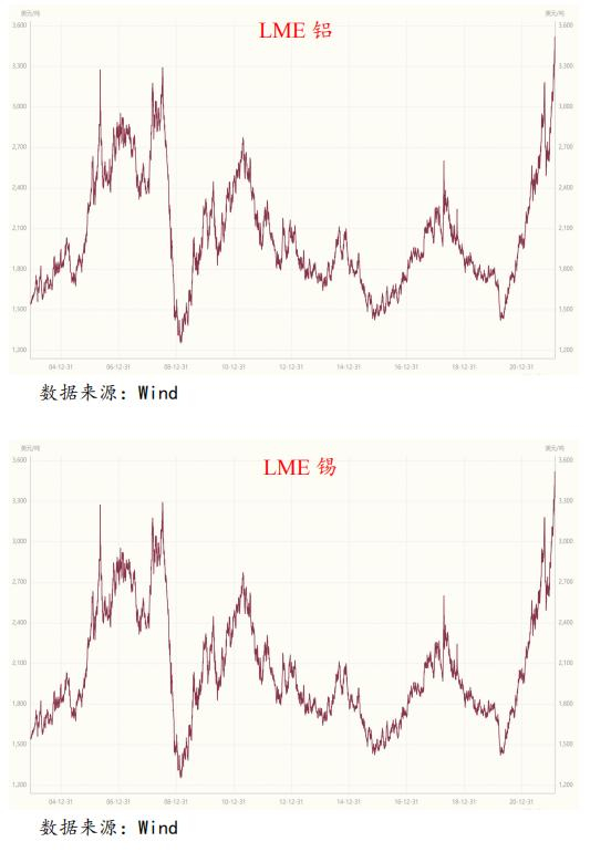 不仅仅是能源类商品,基本金属的价格,年初至今,也普遍出现较大幅度的上涨。典型的如,LME铝价格上涨了24%、并刷新历史新高,LME锡价格上涨18%、刷新历史新高,LME镍、铅、铜价格涨幅也分别达到了22%、5%、3%。