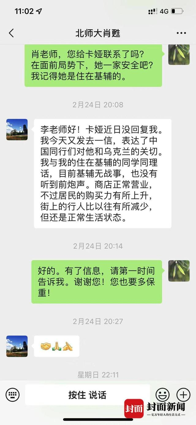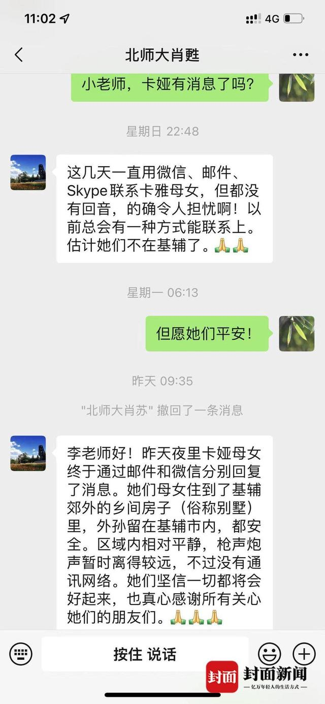 卡娅母女在回复消息中称,她们母女住到了基辅郊外的乡间房子里,卡娅的外孙留在基辅市内,“都安全”。同时,信息中还提到了基辅目前的情况,“区域内相对平静,枪声炮声暂时离得较远,不过没有通讯网络。”