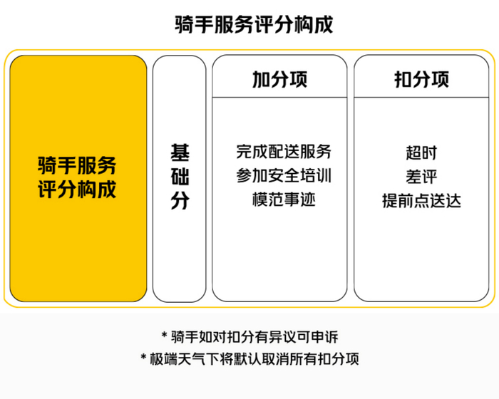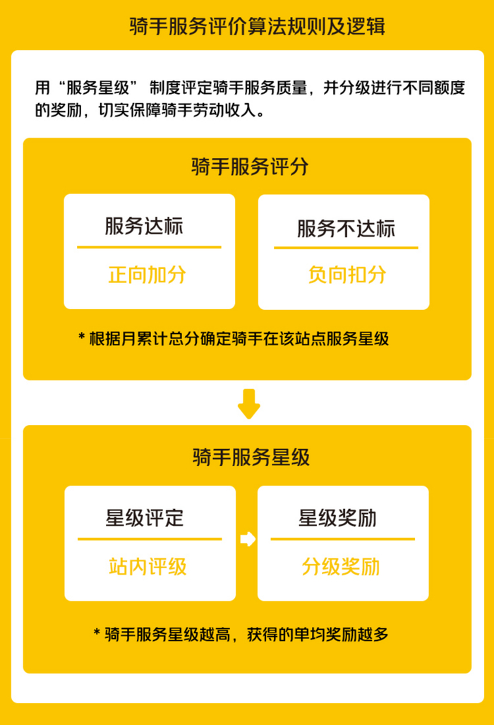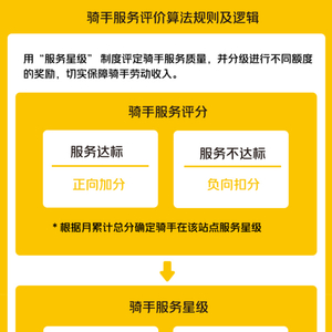 “服务星级”机制下,骑手每月的“服务星级”越高,单均奖励越多,星级根据骑手月度积分在本站点的排名确定。加分项包括安全培训、模范事迹等,针对差评、超时等情况的处理,则从原来合作商制定的扣款改为扣分。对于跑单时间较短的骑手,新机制还设置了一定次数的免扣分机会。“服务星级”一方面强化了对骑手的正向激励,引导骑手工作方式从单纯追求单量向追求综合服务质量转变,另一方面也改变以往合作商相对简单的管理方式,延长评价周期,让骑手在扣分后可通过加分项获得弥补,尽可能降低偶发状况对骑手收入造成的影响,降低骑手配送压力的同时,也有助于提升用户体验。