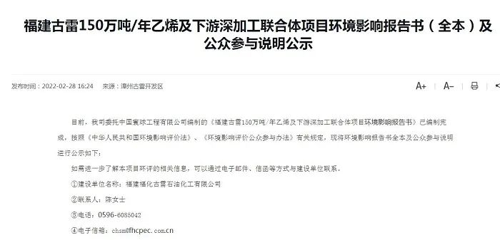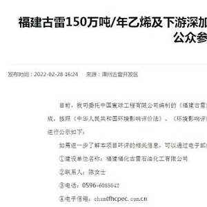 近日,福建漳州古雷开发区网站公示了《福建古雷150万吨/年乙烯及下游深加工联合体项目环境影响报告书》,披露了项目的详细情况。