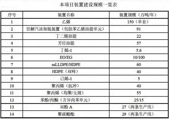 项目新建一套150万吨/年乙烯装置。通过蒸汽裂解方式生产乙烯, 进而延长产品链,生产下游石化产品。主要产品包括乙烯焦油、 裂解碳五、 丁二烯、 苯乙烯、 甲苯、 环氧乙烷、 一乙二醇、 二乙二醇、 聚乙烯、 聚丙烯、 聚碳酸酯等。