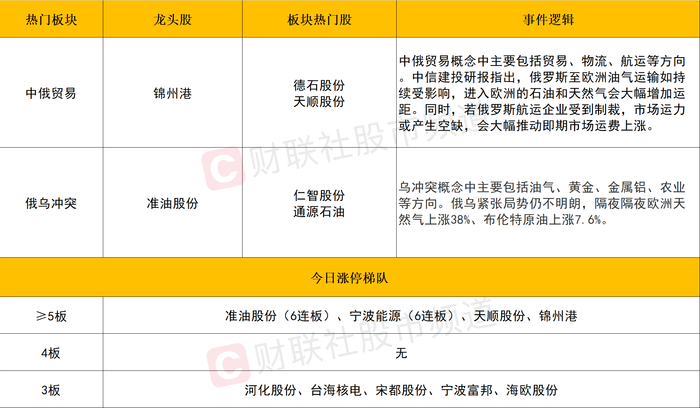 中俄贸易概念和俄乌冲突概念继续大涨。截至收盘,中俄贸易概念中,港口、物流、航运等概念股上演涨停潮,锦州港、天顺股份、宁波海运、长久物流、连云港、中成股份、辽港股份、招商南油、中创物流、中国外运等十余股涨停;俄乌冲突概念中,油气概念股上演涨停潮,准油股份、仁智股份、通源石油、新潮能源、淮河能源、广汇能源、贝肯能源、德龙汇能、胜利股份、博迈科等十余股涨停。