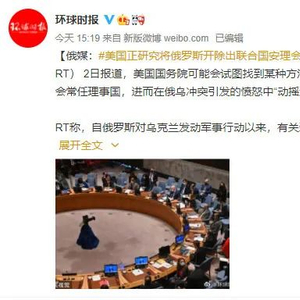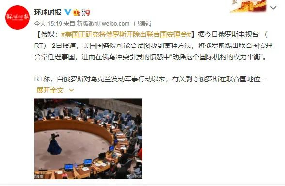 据环球时报微博消息,据今日俄罗斯电视台(RT)2日报道,美国国务院可能会试图找到某种方法,将俄罗斯踢出联合国安理会常任理事国,进而在俄乌冲突引发的愤怒中“动摇这个国际机构的权力平衡”。