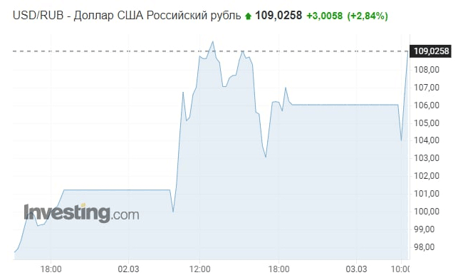 当地时间3月3日,俄罗斯莫斯科外汇交易所的美元汇率创下新高。截至目前,卢布对美元汇率短暂跌破110比1。