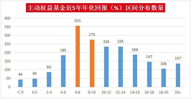 有人会说10年太长,很多时候拿不到10年,那我们再测试下5年的维度,即全市场成立年限在5年以上的主动权益基金,近5年年化回报分布,结果如下: