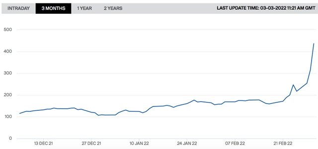 洲际交易所(ICE)的数据显示,欧洲煤炭价格从此前的不到200美元/吨涨至450美元/吨。素有欧洲天然气价格“风向标”之称的TTF基准荷兰天然气近月价格则从2月23日的75欧元/兆瓦时涨至近200欧元/兆瓦时。