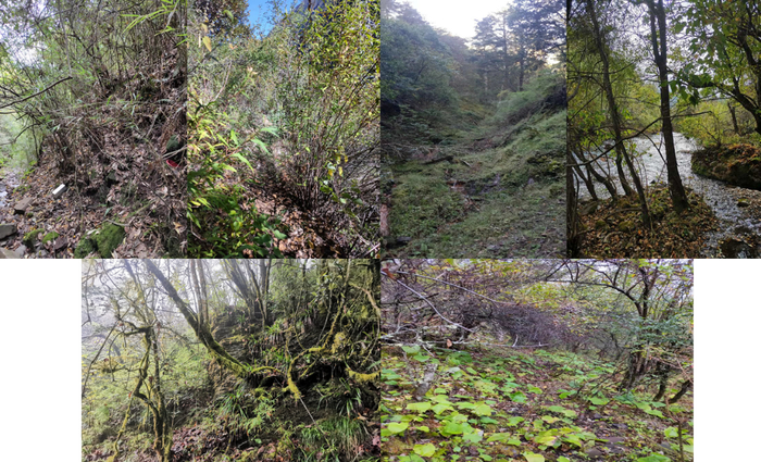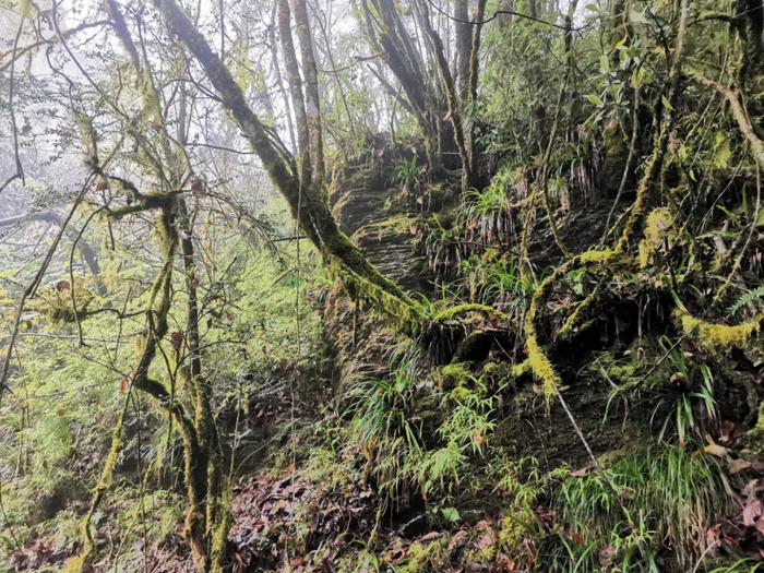 10月12日早上,我们与司机汇合后出发前往第一个站点—天全县二郎山。二郎山以陡峭险峻、气候恶劣闻名,这里是千里川藏线上的第一道咽喉险关,被人们称为“天堑”。二郎山常年多雨、浓雾、泥石流、滑坡不断,交通十分不便,但这也间接保护了当地的生物多样性。下午一点多科考队伍到达天全县城,匆匆吃过午饭继续前往二郎山。越接近二郎山天气愈加阴冷潮湿,我们下午4点左右到达本次的第一个调查区域。伴随着绵绵细雨我们开始选择调查点布置陷阱。每个科考队员肩负两个超过10kg的工具包,攀爬在陡峭的山坡上,由于人为干扰很少,这里的山坡没有任何小路可走,我们只好在湿漉漉的林间穿梭。晚上6点左右结束了陷阱布置的工作,在天黑前返回到了附近的村庄住了下来。