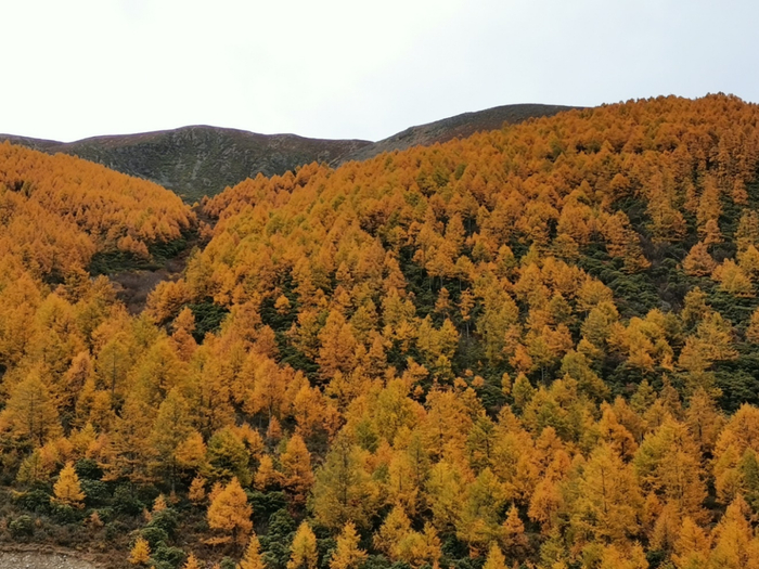 10月20日,结束巴塘的工作后我们驱车赶往稻城。作为《从你的全世界路过》中茅十八口中的蓝天、白雪、金草地的代言,稻城有太多的传说,让我们十分兴奋。由于季节在深秋,远景一片金黄林海落入眼眸,近处成片的玛尼堆为过往行人祈福。