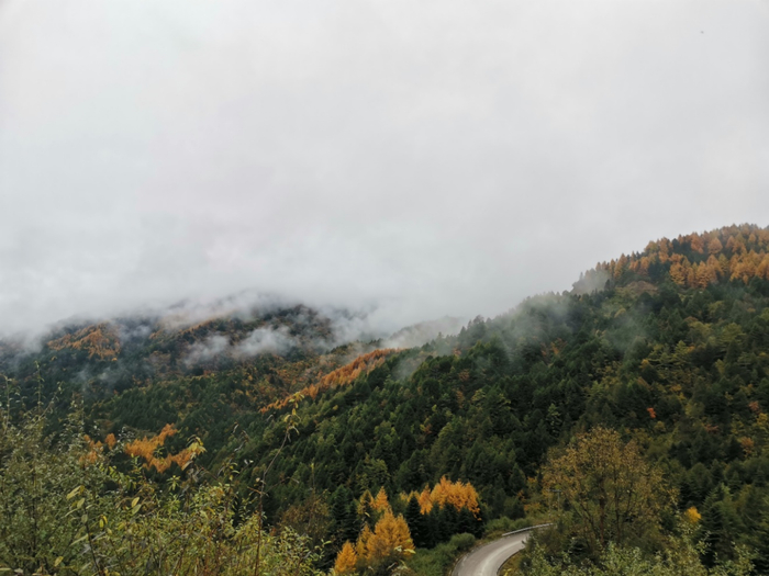 第二天一大早,县城的雨已停,我们吃过早饭立马往采样点赶去,希望在雨来之前结束野外工作。来到山下才发现山里的雨雪好像从没停过,泥泞的山路让我们一路上担心会不会陷车,还好师傅技术非常好,晃晃悠悠接近一个小时总算来到了山顶垭口的采样点。可是垭口风大,飘着雪花,下面又是稠密的矮竹林,上面已积了很多雪,看着来时的路,真是进退两难。大家商量了下决定还是克服一下,按原计划开展工作。就这样我们分别背着装备钻进了稠密的竹林,竹林里面阴森的环境使记忆深处恐怖的画面时常浮现在眼前。两个小时后,队员们总算布设完装备钻出了竹林,但浑身已经湿透,一个个手红通通地直哆嗦。这时雪也停了下来,我们看到垭口树叶黄绿相接,云雾腾升的美景,有点误入仙境的感觉,也真切地领悟到“想看美景,必登险峰”之意。经过两天艰辛的工作,我们收获颇丰,获得了实验室紧缺的一些样品,为这次科考画上了圆满的句号。