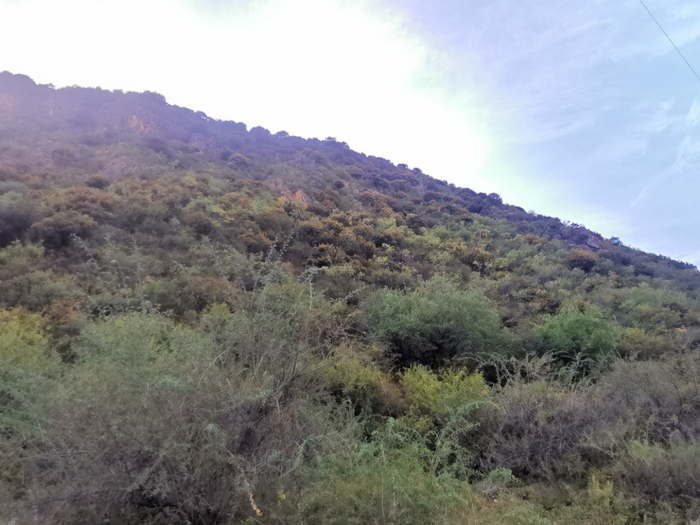 巴塘的“草原”和若尔盖以及甘南的草原有些不同。可能是季节或者海拔的原因,这里的草比较枯黄矮小,也没有成群的牛羊马游荡。在巴塘,我们并没有发现什么较好的生境,由于是干热河谷生境,植被大都是矮小的灌木,就连农家院子里出墙的苹果都长得非常的小巧。我们在离县城40多公里外选择了一处人为活动较少的区域开始工作。这里山石比较陡峭,只能顺着石头往上爬,一路上布满各种各样带刺的灌木,工作回来后浑身都是小刺,手上也留下了一条条细小的伤口。