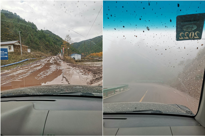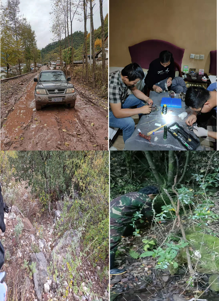 都说上山容易下山难。第三天到了转点的时候,雨也一直未有停下的意思,山路十分泥泞。为了不耽误下午在康定县布设工具,早上天刚蒙蒙亮,我们就出发上山收取工具。泥泞的路上走路已很困难,再背负着20多斤的设备下山更是不易。在上山和下山的过程中免不了脚踩的树枝或草堆会踩塌,摔屁墩儿更是家常便饭。大约在十点,一个个“泥人”从林中回来,驱车前往下一个目的地——康定。
