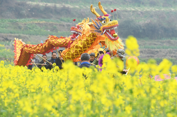 2022年3月3日,重庆涪陵泡桐村,村民们在金黄色的油菜花地中舞龙祈福,迎接“龙抬头”。人民视觉资料图