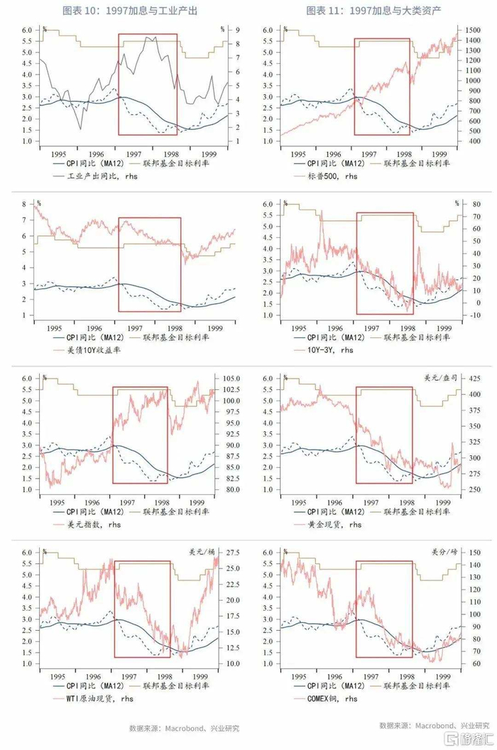 1997年3月,美联储加息25bp后维持利率不变直至1998年下半年开启降息。这一时期工业产出增速在1997年末触顶,CPI增速持续下行,由近3%降至不及1.5%。1997年7月,泰国宣布放弃固定汇率制,东南亚金融危机爆发。1998年下半年发生「狙击港币」、俄罗斯债务危机、长期资本管理公司(LTCM,Long-TermCapital Management)倒闭等事件。