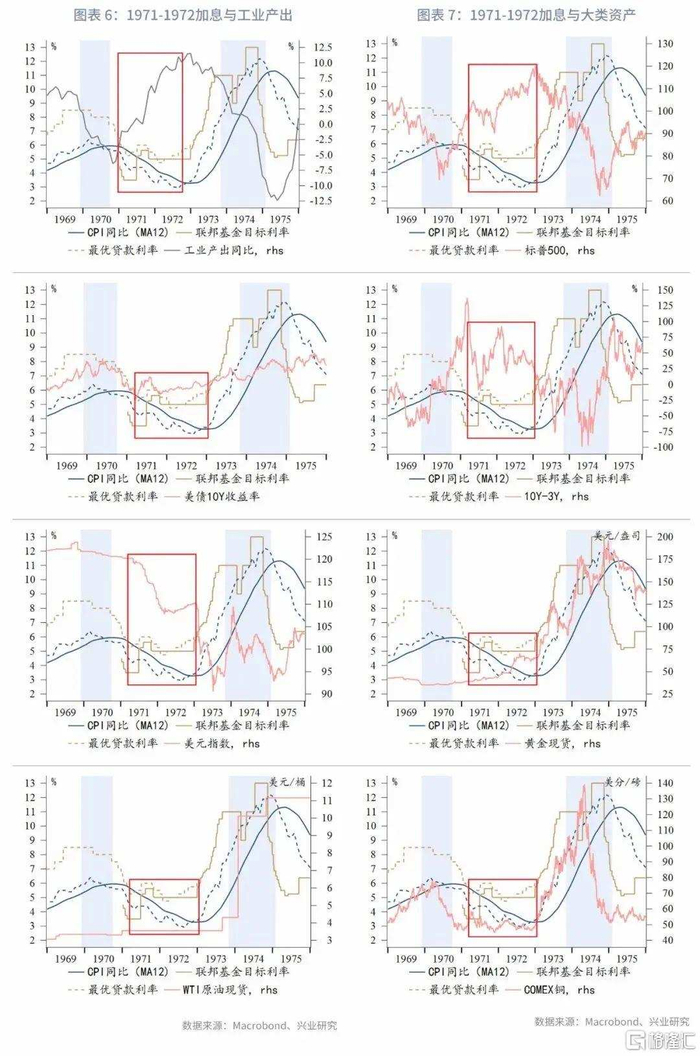 1971年上半年美联储仍在延续经济衰退后的宽松政策,但从6月开始大幅加息,主要因这一时期出现美元危机,资金大量外流欧洲,5月德国率先宣布汇率浮动,随后欧洲货币陆续开始汇率浮动并对美元大幅升值。1971年8月尼克松宣布关闭美元黄金兑换窗口,布雷顿森林解体。当年10、11月美联储小幅降息,联邦基金利率维持在5%直至1973年。不过1972年下半年最优贷款利率开始抬升。这一时期CPI同比增速从5%以上回落至3%左右。与1958-1959年情况类似,1973年初工业产出增速在CPI触底约半年后触顶,1973年末美国经济衰退。