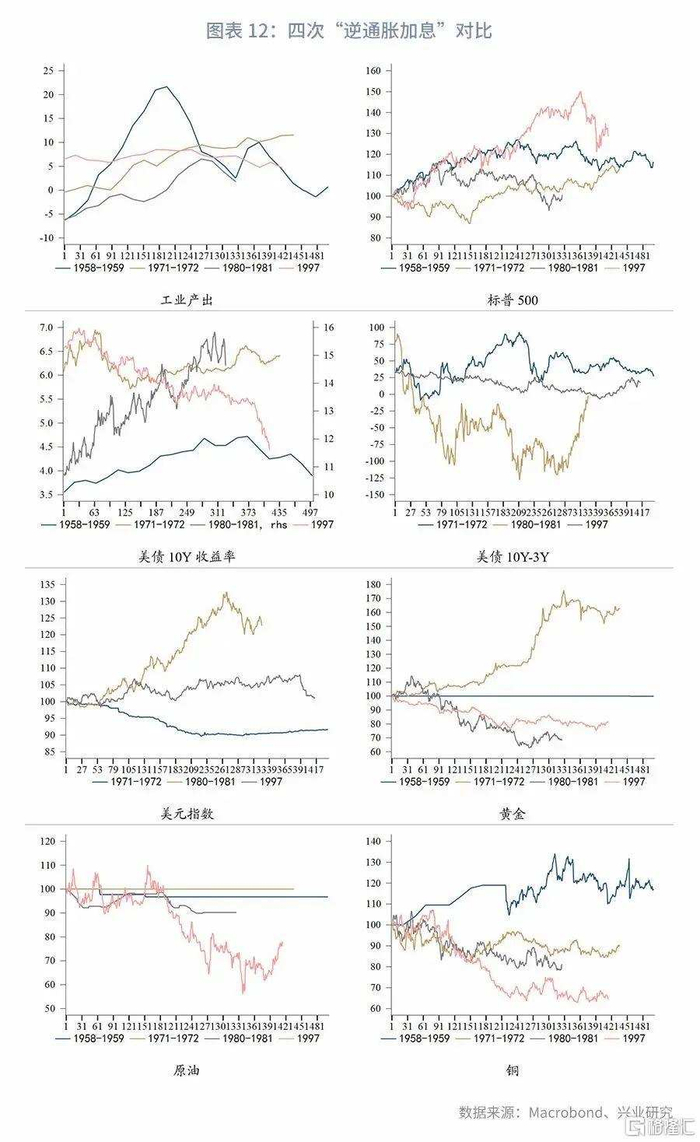 历史上的四次「逆通胀加息」后经济增长通常见顶,随后经济放缓甚至衰退。加息初期和增长见顶时标普500易受到负面冲击。连续加息时,美债10Y收益率倾向于随加息上行,但期限利差下行并不顺畅。除「尼克松冲击」此种极端情景外,美元指数趋于走强。大宗商品在加息之初通常维持强势,此后随通胀增速回落而出现震荡调整。