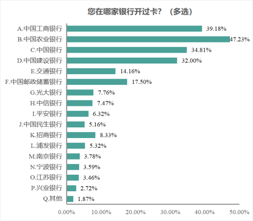 调查发现,开卡排名前五位的银行均是国有商业银行,依次分别为中国农业银行、中国工商银行、中国银行、中国建设银行、中国邮政储蓄银行。47.23%的消费者在中国农业银行开过卡,39.18%的消费者在中国工商银行有开卡经历,中国银行、中国建设银行、中国邮政储蓄银行占比分别是34.81%、32%、17.5%。