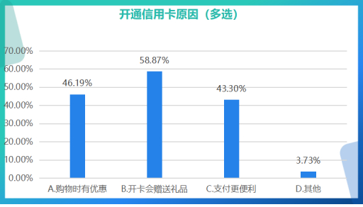 在开通信用卡的理由(多选)中,开卡会赠送礼品的消费者占比58.87%,由于购物时有优惠的消费者占比46.19%,认为支付更便利的消费者占比43.3%,其他原因占比3.73%。